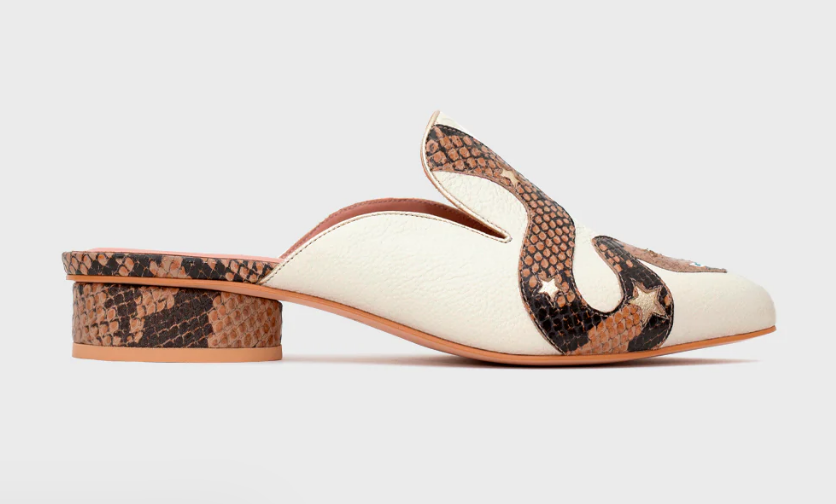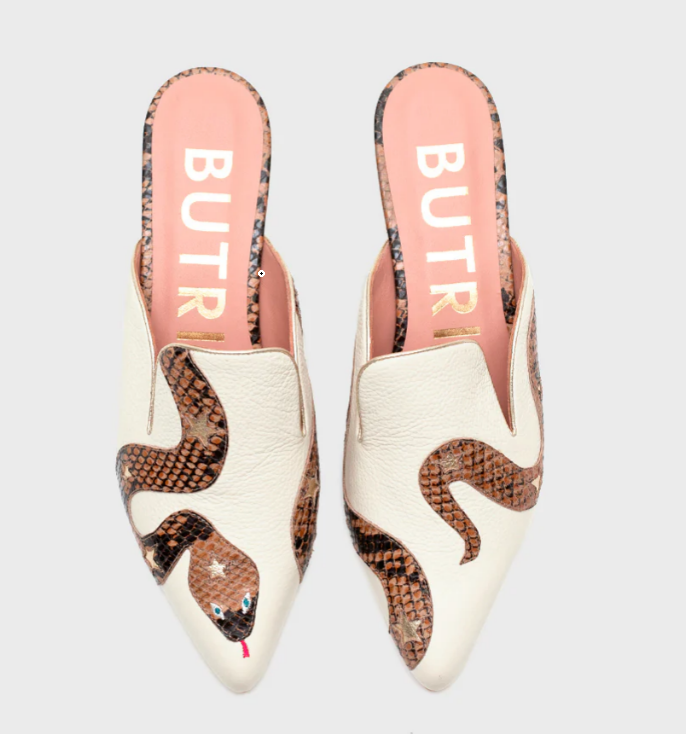 The Anaconda Mule Flat is the perfect shoe to accompany you in your day to day life with a 2cm heel. It features a snake in various shades of leather that is hand-woven onto the cream leather of the mule flat