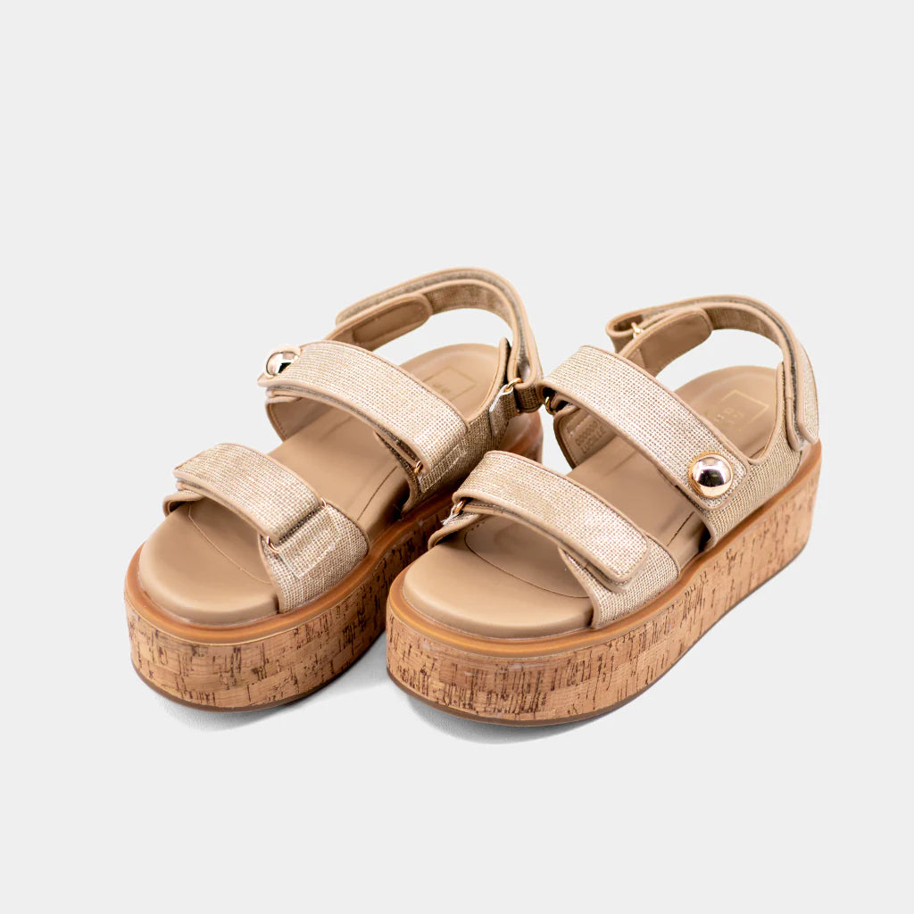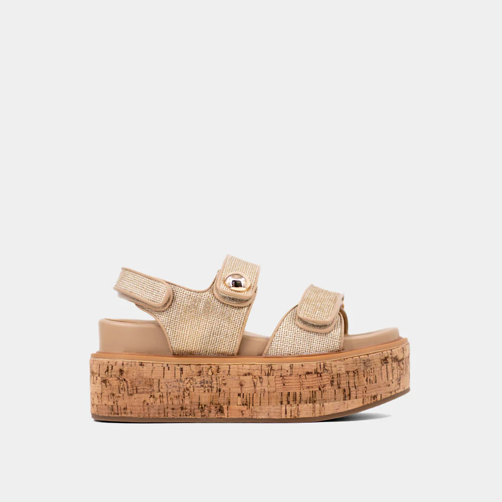 Perfectly balancing glamour and comfort, these sandals are crafted from shimmering woven fabric that adds a luxe texture to any outfit. The natural cork platform enhances the airy design, while the cushioned footbed and adjustable velcro straps promise an effortless fit.