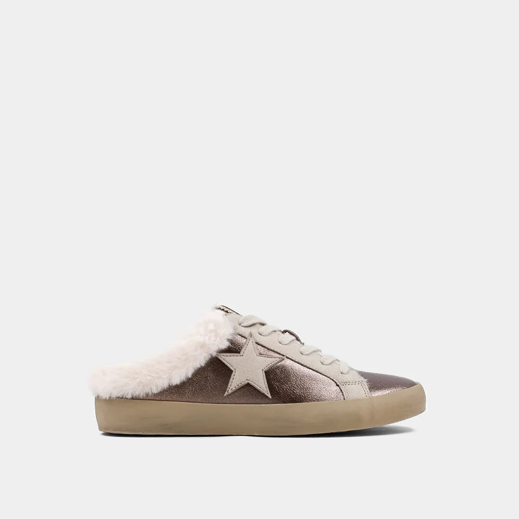 Step out in style with these versatile slip-on sneakers, crafted from luxe faux metallic leather and lined with soft faux fur for cozy comfort. The elevated rubber sole provides reliable support, while the sleek design features a star detail for a touch of flair.